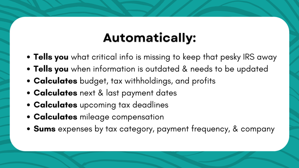 With a glance you can see if you're over/under budget, estimated tax withholdings, and your total profits (minding taxes and expenses) so you can focus on what really matters - growing your business and getting that dough!! 💰💰💰